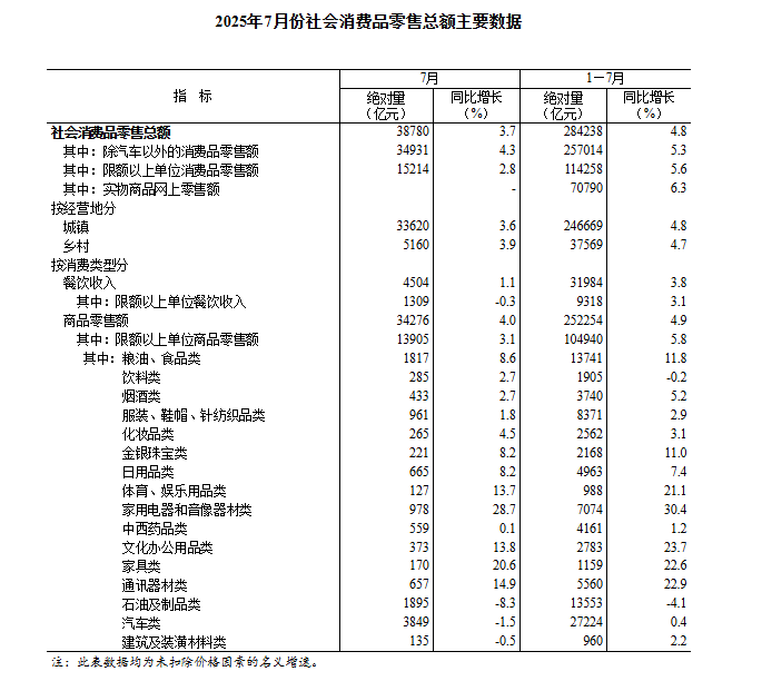 8月15日,国家统计局发布数据显示,7月份,社会消费品零售总额38780亿元,同比增长3.7%。其中,除汽车以外的消费品零售额34931亿元,增长4.3%。1~7月份,社会消费品零售总额284238亿元,增长4.8%。其中,除汽车以外的消费品零售额257014亿元,增长5.3%。