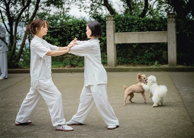 2021年5月3日,浙江台州温岭小广场上,两只小狗相互搭着前腿,似在学着晨练的人们打太极。梁丹斌 摄