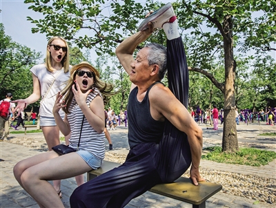 2016年5月22日,北京天坛公园,一位练功老者的功夫让外国游客大为惊叹。 屈兰根 摄