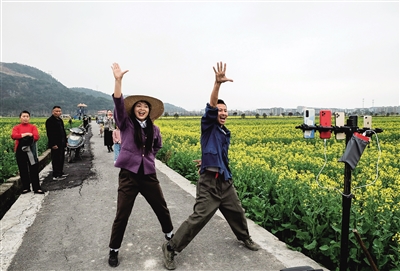 浙江的春天,田间油菜花开,生机勃勃,人们在直播展示美丽风光。陈成光 摄