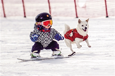 2021年11月18日,河北张家口崇礼滑雪场,萌宝王予玑在宠物狗“旺仔”的陪伴下滑雪。当时只有11个月就能单板滑雪的王予玑,后来出现在了2022年北京冬奥会开幕式短片中。宋清中 摄